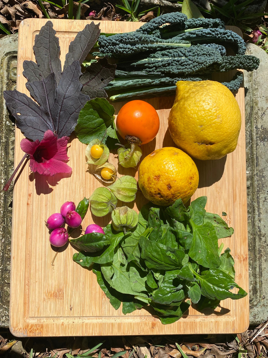 Locally sourced food is the name of the game. We have several garden beds and are working these spaces to add to the food supply and foster connection to the earth. We compost all biodegradable matter to add back to the earth. We have fruit (orange, lime, lemon, guava, avocado, banana…) on the property and share these in our meals.